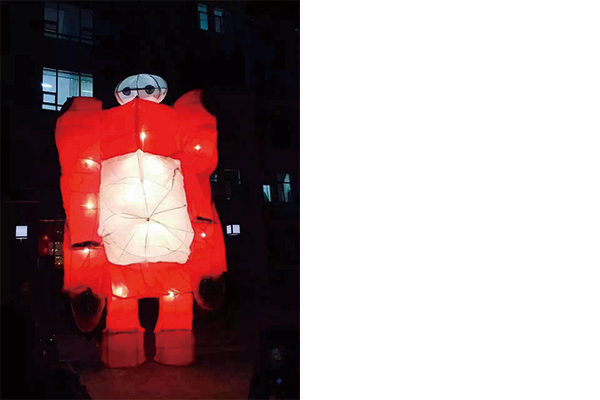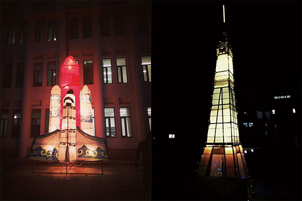 制作班级:15级工业班 名称:腾飞 花灯名为"腾飞",寓意着美院蒸蒸日上节节攀升,花灯上附有蒙古特有的纹路象征着内蒙特有的民族特色。高大的火箭与飞机彰显出工业班的气势,同时也标志着当代学生火的气势与向上的意志。让花灯点亮我们美好的生活,愿工业班越来越好!