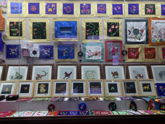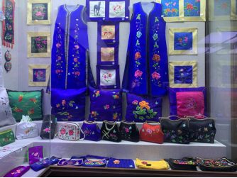 最后,参观了图什业图王府刺绣文化博物馆,刺绣博物馆展厅建筑面积1800m2,有6个单展厅构成。博物馆集收藏、研究、展示、教育、宣传、娱乐、购物等功能于一体的具有专业特色、民族特色、地方特色的平民化博物馆。(见图15—17)